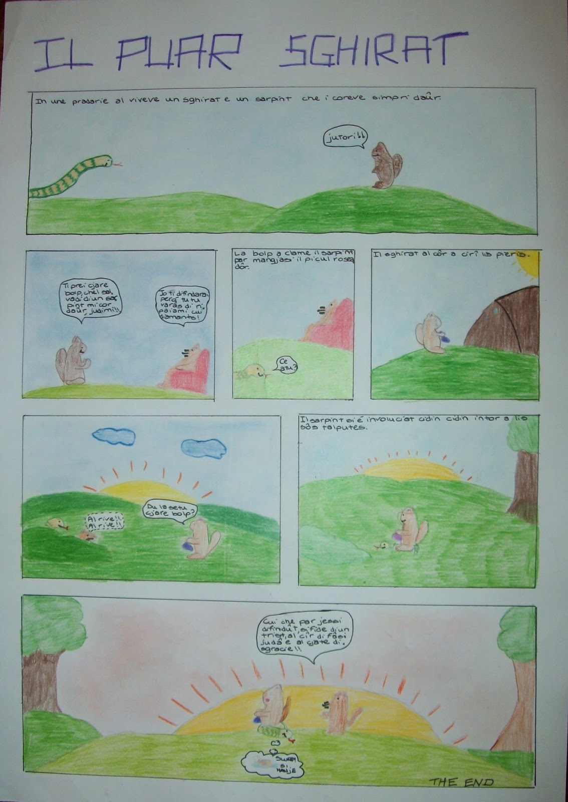 Ta une fatorie, al viveve un sarpint che al coreve daûr a un sghirat. Spaurît il sghirat al va a domandâ jutori a une bolp salvadie, disint: “Ti prei bolp, chel carogne di un sarpint, mi cor daûr cence fermâsi, judimi!”. “Va ben, ti difindarai, però tu tu varâs di dâmi alc sore!”; il sghirat al dîs di sì e al domande: “Ce varaio di dâti sore?”, “Diamants” a rispuint la bolp.