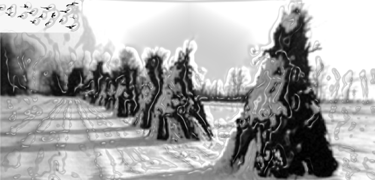 E jere une zornade plombice, l’Invier si jere insiorât in chê grande planure sterpe, si viodevin dome cualchi file di staipis di cjanussis. I morârs, dispueâts des fueis, a someavin dai scheletris, come se i lôr ramaçs a fossin dai braçs si slungjavin in cercje dal bon timp che ju varès vistûts. Cualchi piçule besteute salvadie e coreve dilunc chês cumieris di tiere dure e glaçade cirint la tane par metisi al sigûr.