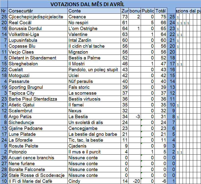 E si rive ae classifiche gjenerâl, e tocje dî che il mês di Avrîl al è stât un turni che al à puartât sorpresis soredut a mieze classifiche, plui che adalt. Lis primis 4 scuadris si son confermadis e aromai a paronin la zona Champions. Cjicechepicjedispicjelacite, Reâl Cocâl, Borussia Dordul, ma il Volketritrai-Liga e il Sbreghebalon a àn fat un biel salt indenant, insieme cul Copasse Blu, che al à profitât dai pas fals di Atletic Gjatui, Sporting Brugnul e Barba Pisul Stentadizza. Intal mieç de classifiche, Tapioca City, Vecjo claes e Lupusinfabula a àn tornât a masanâ ponts cu la lôr costance, e de posizion numar 8 ae 14 al è dut un grant barufon, cundut che cumò i ponts a disposion a son potenzialmentri 29. Ancje parcè che il Cuelalt, che al pareve discomparît dilunc dal Invier, al è jentrât in gare e al à za tacât a lâ di rive sù. E cun di plui o vin viodût ancje altris strategjiis di zûc, come la conte a fumuts, che e à paiât dome un toc, o la conte lungje, che invezit no à sodisfat.