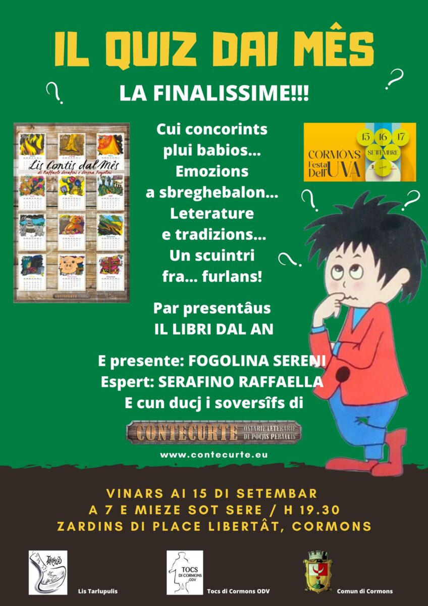 Stant che vuê o sin lunis, e us rive la mail di gnovis de Ostarie, us din la gnove une vore adore, cussì o podês meti la serade tes vuestris agjendis. Insome… Vinars ai 15 di Setembar, tor 7 e mieze sot sere, a Cormons, inte Suaze de Fieste de ûe, o varìn ancje il nestri spetacul “Il quiz dai mês” che ancje se lu vês za viodût o savês che al cambie simpri. Par cumò, dal sigûr, o varìn la super Fogolina Sereni, a conduzi il bal, e l’innomenât Serafino Raffaella.