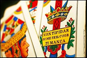 Al tocjave al vieli, di zuiâ, e chel, dopo vêsi gratade le panze, sot de bluse rosse, al veve messedât la barbe intant che la sô compagne i veve fat moto di re, ma sbaliant i timps, e cussì la veve viodude dome l’ostîr, che al veve fraintindût e i veve puartât un altri tai. La prime man, in ogni câs, e jere lade ai doi vielis: Lussie i veve molât il scartin di spadis e il piçûl al veve sacrificât il trê di denaris. Dut al podeve inmò sucedi, e chel as di cope, se al fos colât de bande de briscule, al varès dade la vitorie.