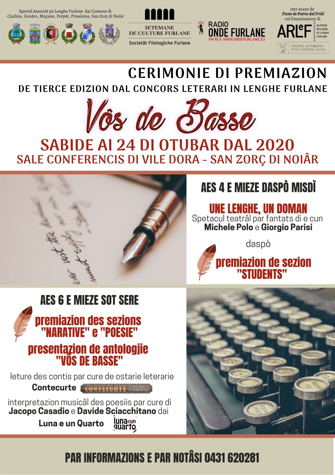 Ma savêso cuale che je la gnove finâl? Che e je jessude une publicazion cu lis contis premiadis e lis poesiis des ultimis trê edizions, Vôs de Basse, par cure propite de Filologjiche Furlane, regalade a chei che a jerin te serade e che – gnove inmò plui biele – la cuarte edizion di Vôs de Basse, tal 2021, si fasarà! E nô o sin une vore contents e za di cumò o tachin a dî che bisugne saltâ fûr dal scûs e fâ cressi lis robis che a meretin cressi. Come cheste.