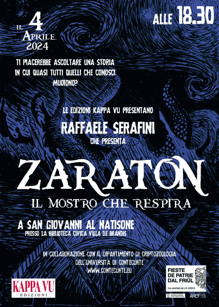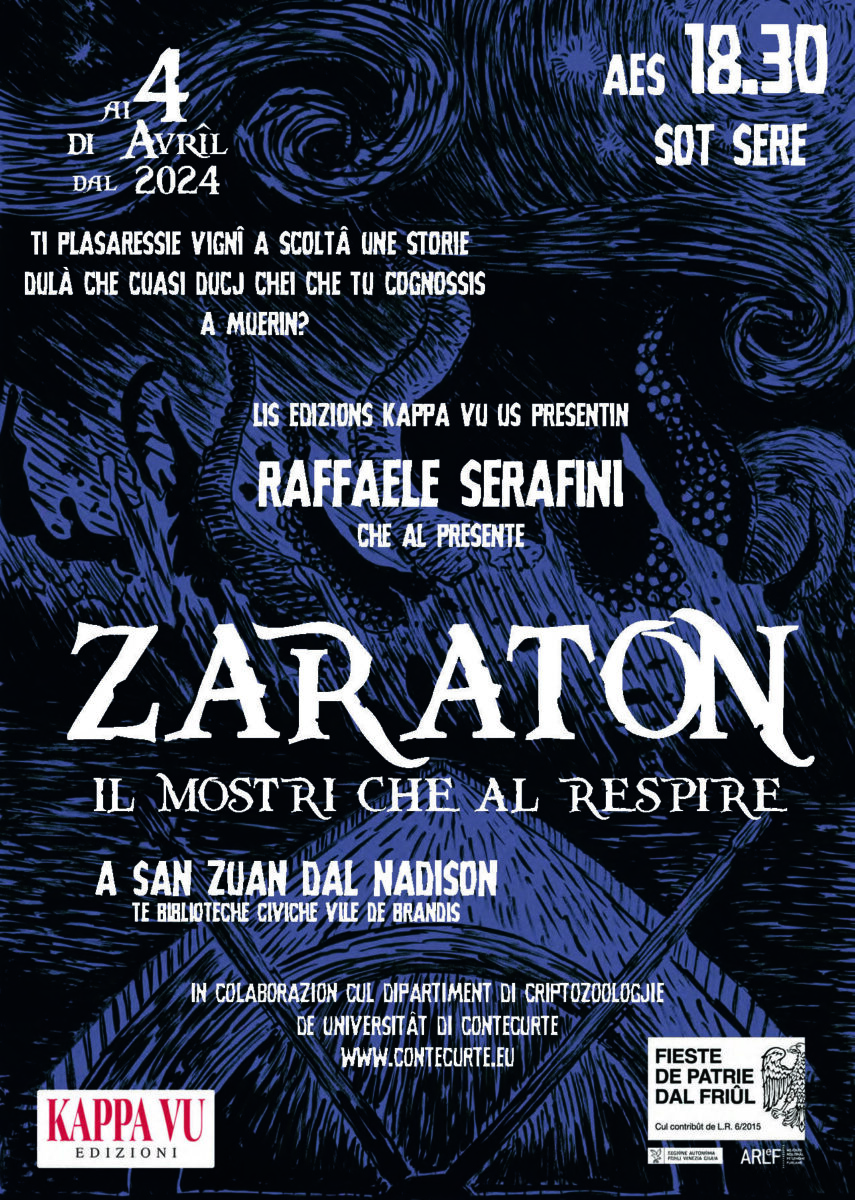E o sin ancjemò daûr a pensâ a la prime presentazion de La Stagjon des Contis, ma come che o savês, il nestri Ostîr nol rive a stâ fer e alore ve ca, un altri apontament GALATIC dulà che o metin adun la fuarce soversive de nestre Ostarie. In gracie des manifestazions inte suaze de Fieste dal Friûl, inmaneadis cu la poie de Arlef e sot dal voli de sô cjase editore, la Kappa Vu, ZARATON, la creature che aromai o cognossês une vore ben e va nuiemancul che a SAN ZUAN AL NADISON.